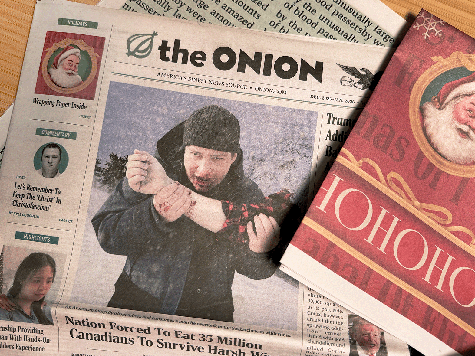 Custom holiday wrapping paper for the December 2025 - January 2026 print issue of The OnionDeliverables:Custom wrapping paper illustrations